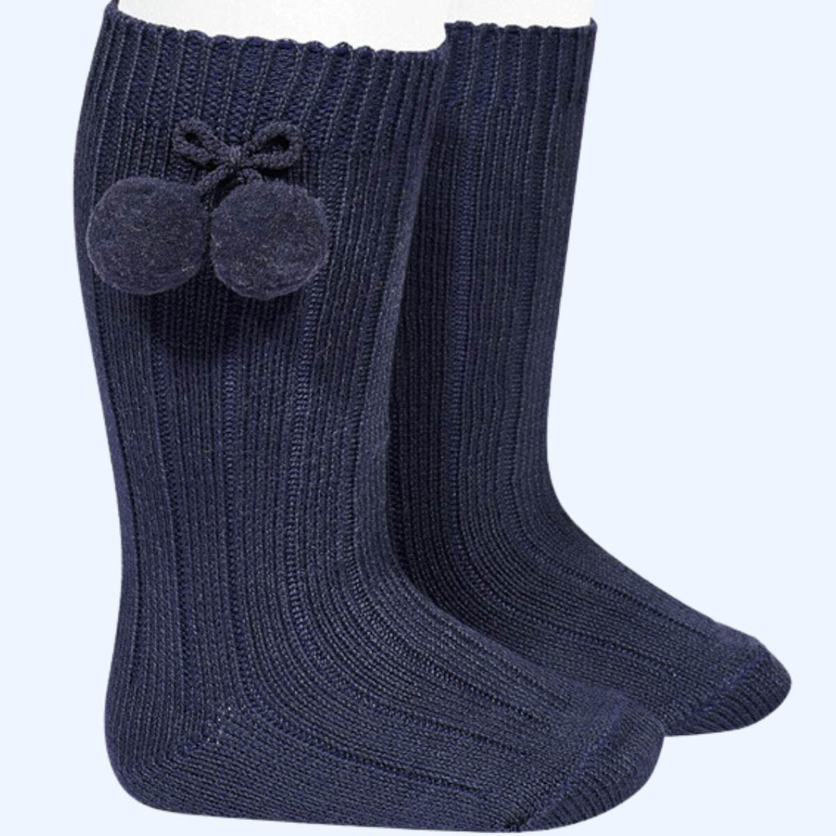 Calcetín alto acanalado de punto cálido con borlas en color azul marino