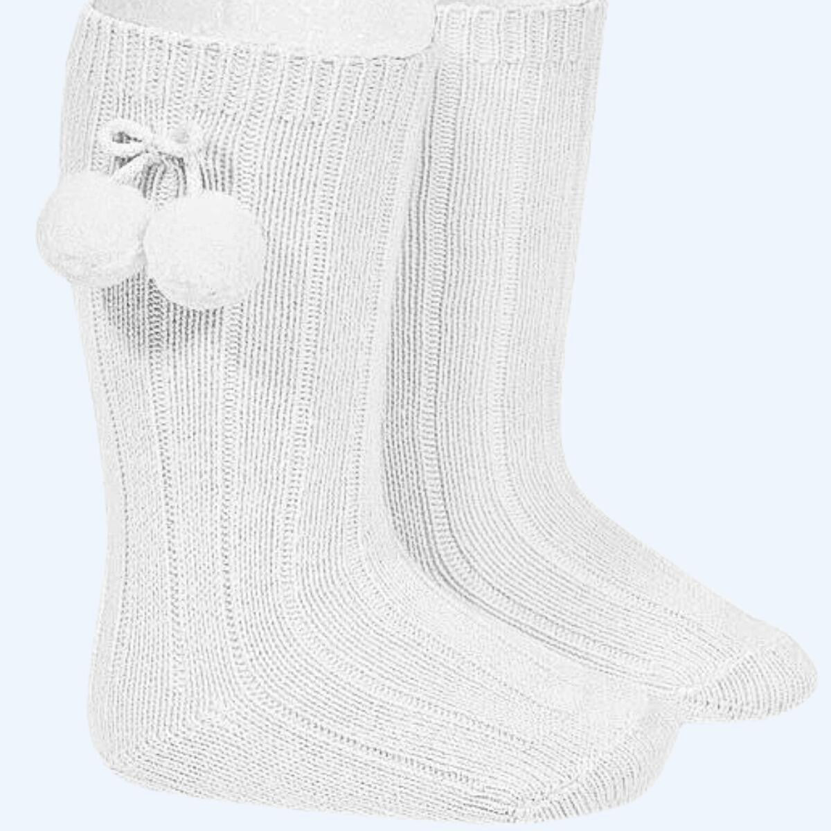 Calcetín alto acanalado de punto cálido con borlas en color blanco