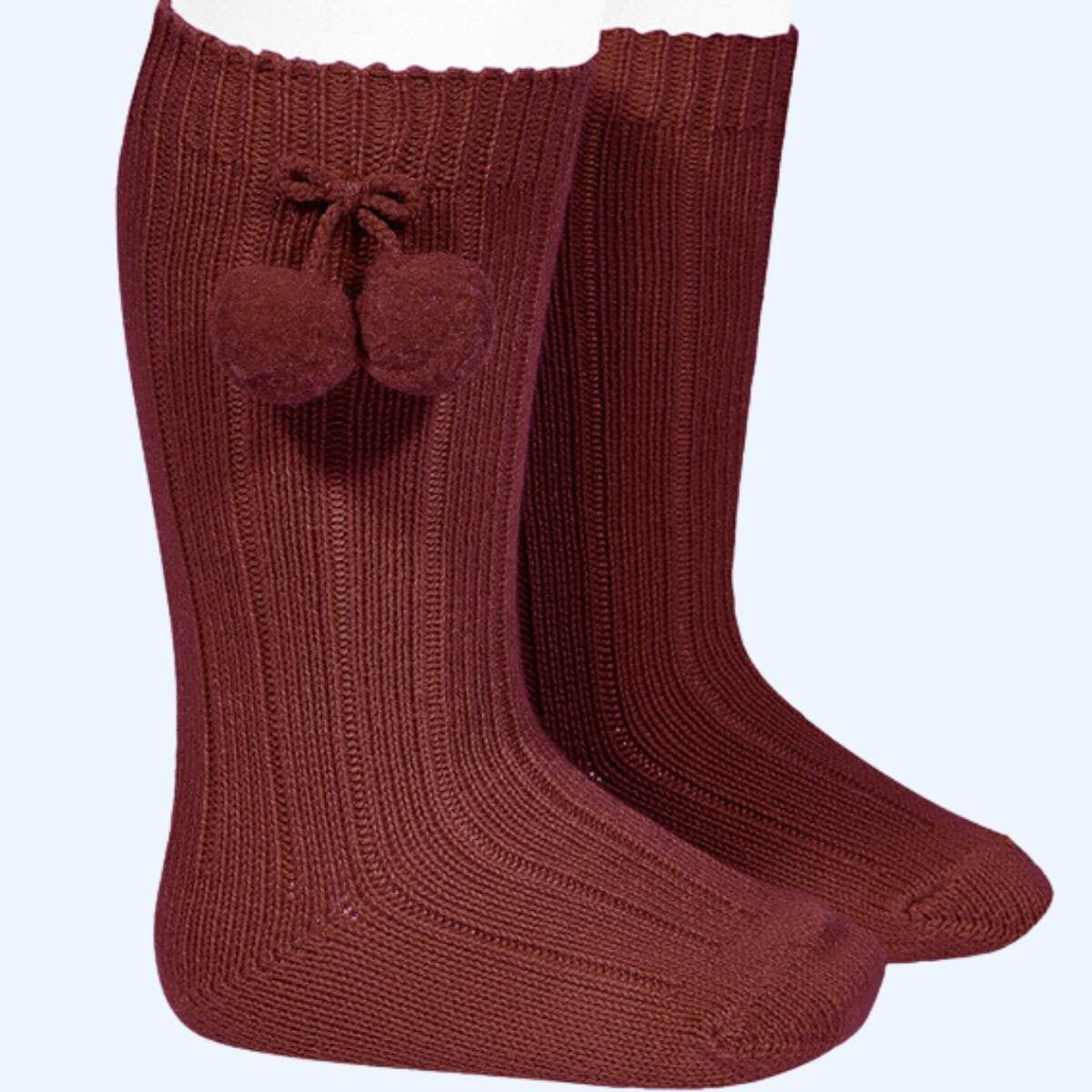 Calcetín alto acanalado de punto cálido con borlas en color vino