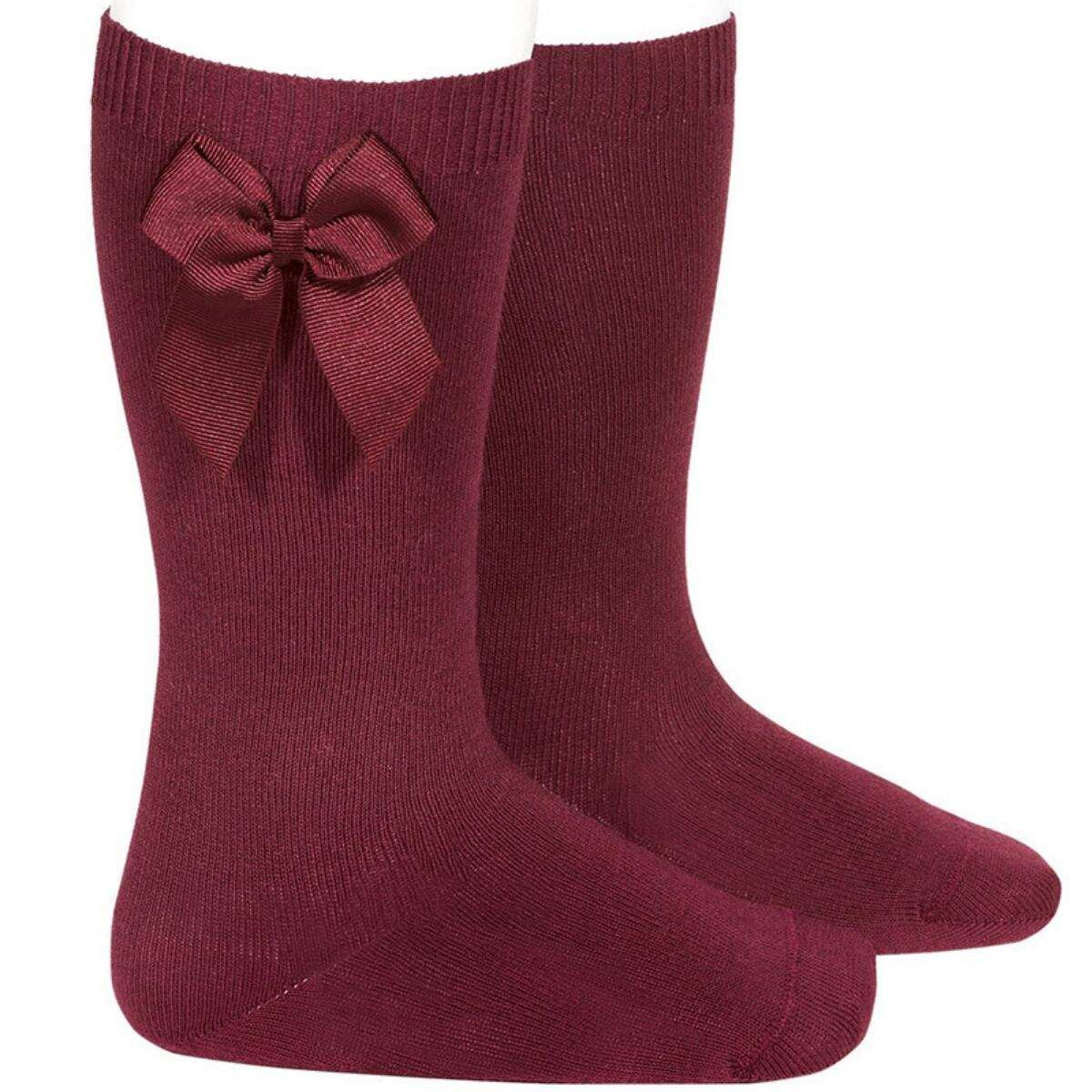 Calcetines altos de punto liso con lazos de gros-gain en color vino.