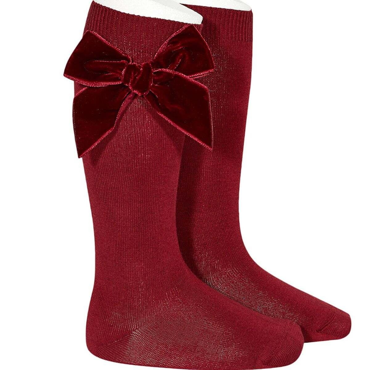 Calcetín alto de punto de liso con lazos de terciopelo en color vino