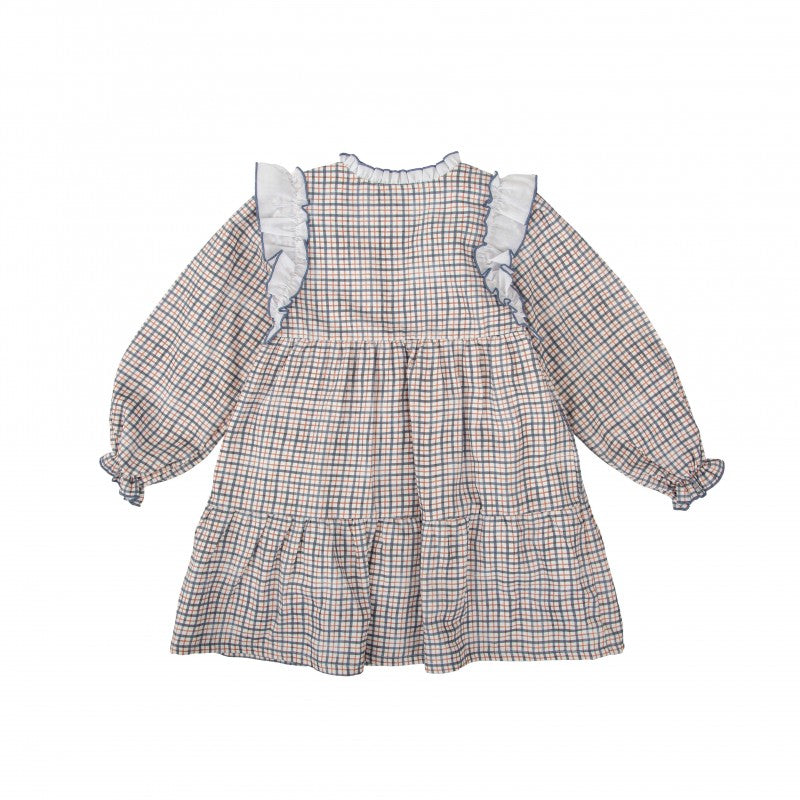 El diseño presenta un canesú con pequeños frunces, cuello redondo con ribete decorativo y botones en la parte delantera para facilitar el vestido. Las mangas rematadas con puño elástico fruncido aportan comodidad y un acabado coqueto.